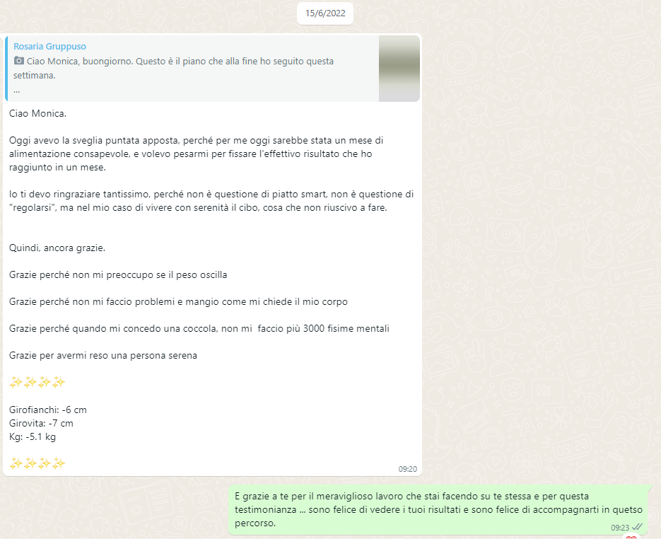 Prima di tutto ho avuto una grande liberazione dalla bilancia, ormai era diventata un'ossessione controllare il peso tutti i giorni. La mia mente sta cambiando rispetto al cibo, sono più rilassata, digerisco meglio e dormo più profondamente.