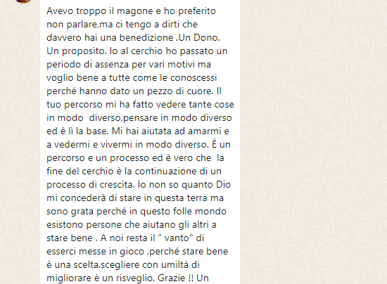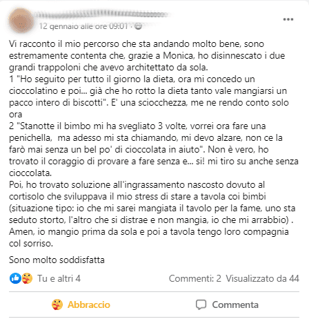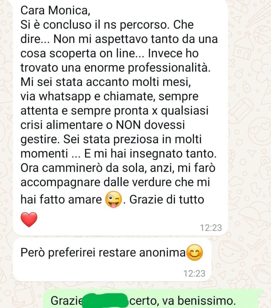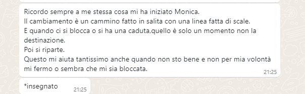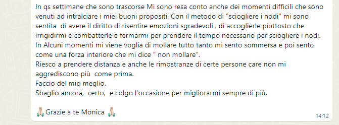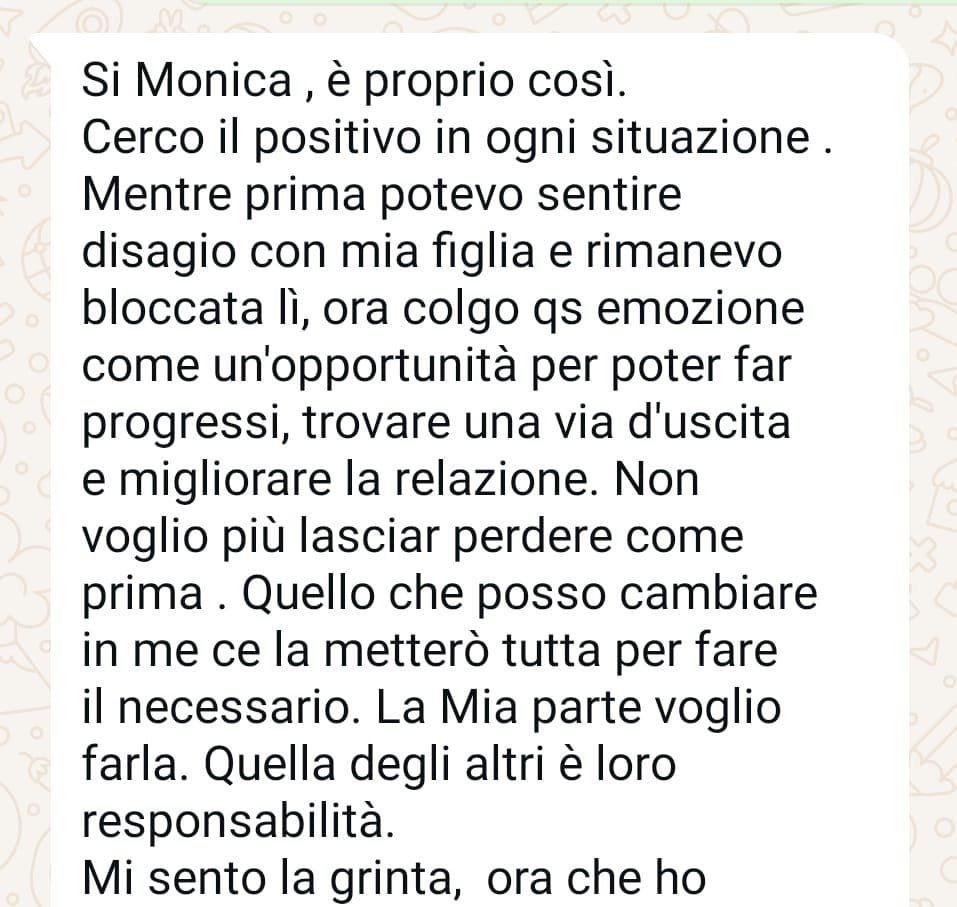 Io vengo da un ambiente religioso in cui quando stai affrontando una situazione difficile tutti si improvvisano psicologi dispensando consigli su cosa dovresti fare e di solito il consiglio era sempre “devi fare qualcosa in più”, non mi fidavo più di nessuno e Monica era l’ultima spiaggia, dopodichè mi ero già detta che mi sarei arresa, e invece si è rivelata la strada giusta.