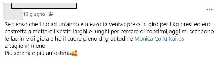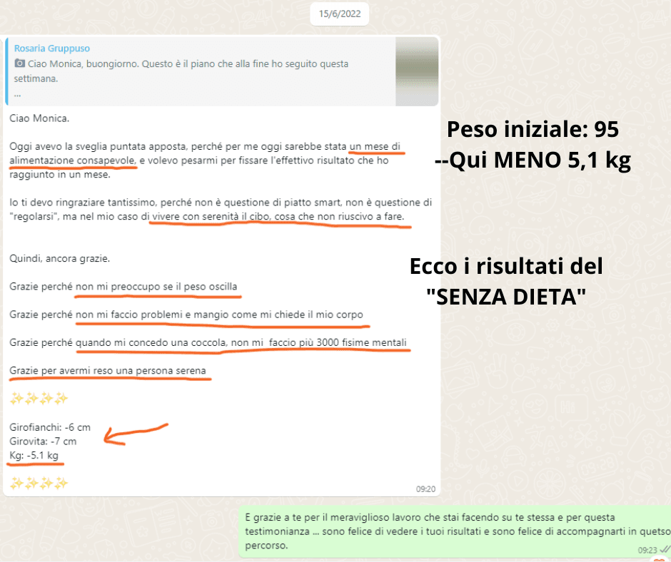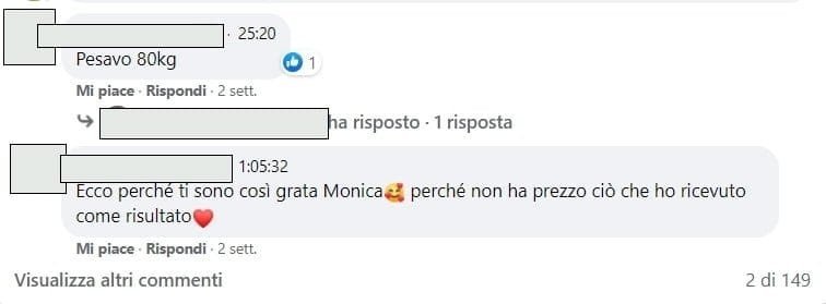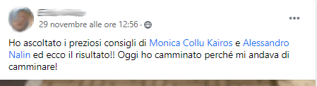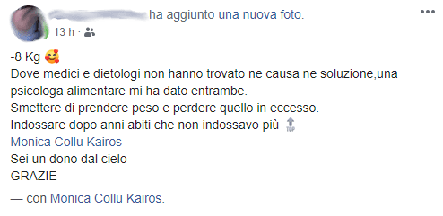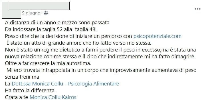 Quello che mi ha colpito di più della dottoressa è stato l’ascolto , la presenza perseverante di “qualcuno” accanto che non mi ha lasciata sola a fare il percorso, i consigli sempre appropriati e il percorso perfettamente strutturato con i video e gli esercizi che, se fatti con assiduità, danno risultati palesi.