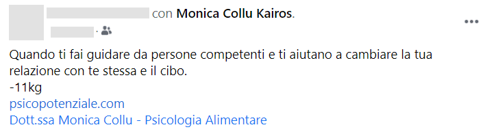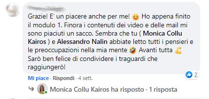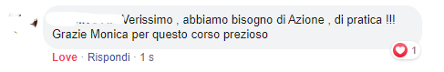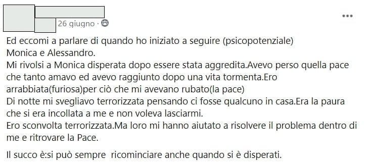 “Ho conosciuto Monica tramite un amico in comune, al quale avevo parlato di un problema che non riuscivo a superare. Lui mi ha consigliato di parlarne con Monica e io l’ho contattata. Inizialmente ho avuto resistenza nel farmi aiutare perché pensavo di potercela fare da sola. Ma quando poi ho capito che da sola non ce la facevo l’ho ricontattata. La prima volta che l’ho contattata lei è stata molto disponibile e mi ha solo ascoltata e non mi ha assolutamente forzata ad iniziare un percorso. Mi ha lasciata libera di capire qual era il momento più opportuno. Ma quando ho iniziato il mio percorso con lei ho avuto grandi risultati e, cosa sorprendente in brevissimo tempo. Sono uscita da quel blocco che non riusciva a farmi andare avanti. Certamente quello è stato soltanto un inizio e non un punto di arrivo ma un inizio che mi ha portato veramente a cambiare proprio molte cose nella mia vita. Tra l’altro ho partecipato anche a dei corsi organizzato da lei, dai quali ho avuto straordinari risultati sia per la mia crescita personale che per la mia crescita professionale. Io veramente consiglio a tutti di fare un percorso con Monica perché Monica è una persona disponibile, vera che ti sa ascoltare e indirizzare.”